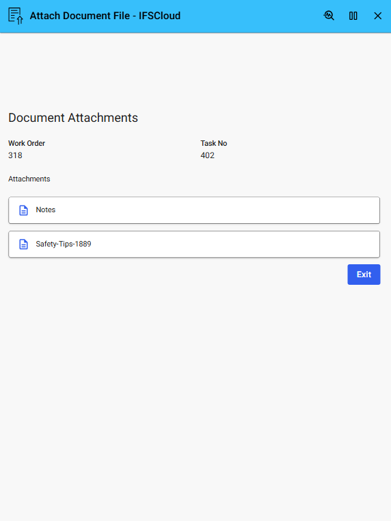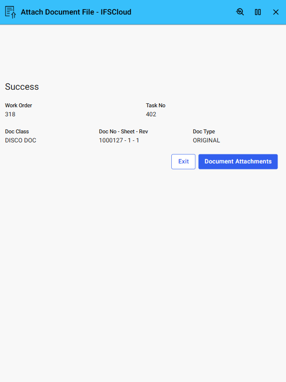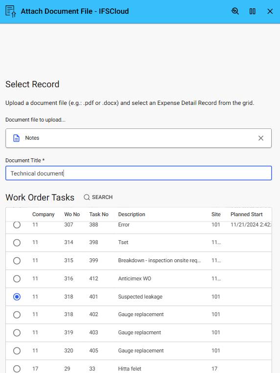 This application example demonstrates how to upload and attach a document file to IFS Cloud using Novacura Flow. Users can select a file—such as a PDF or DOCX—and link it to a specific business object like a work order, purchase order, or customer record.