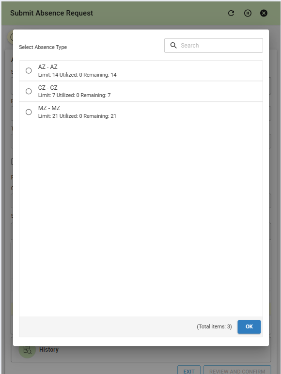 Absence Type – Pick from available types and instantly see how many days you’ve used and what’s left.